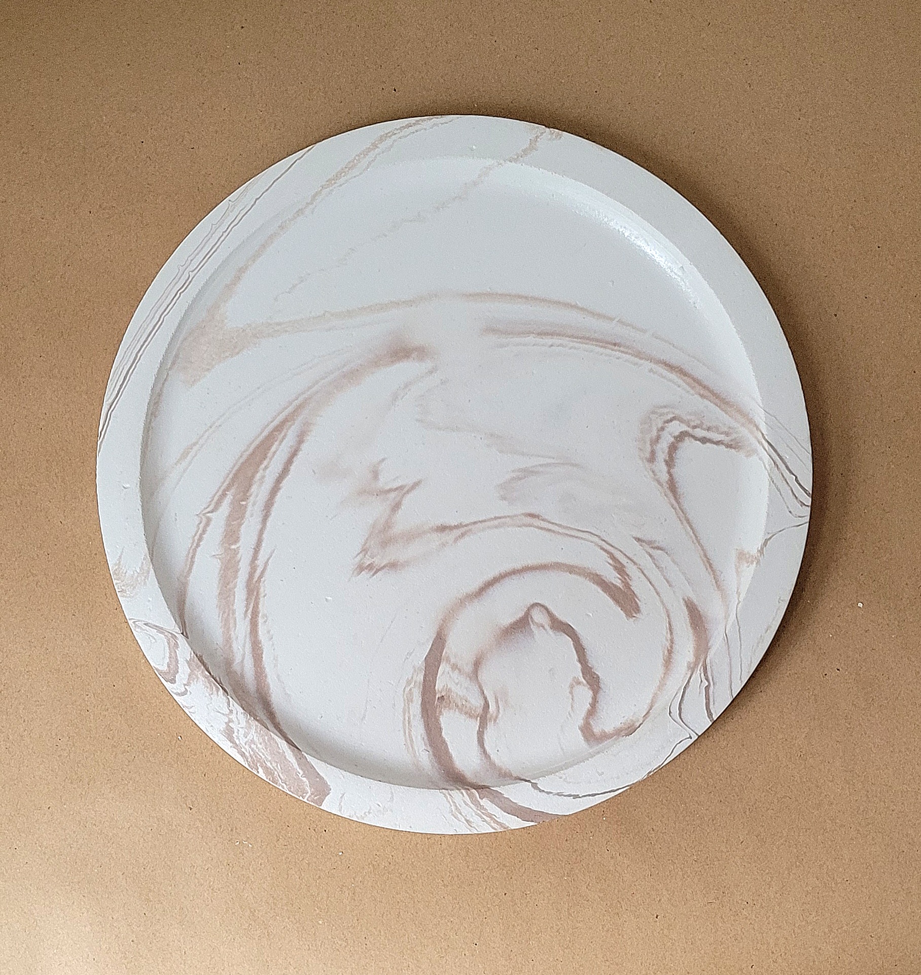 سینی گرد لبه دار آرتیلوکس، زمینه سفیذ رنگ با طرح ابروبادی نسکافه ای در 2 قطر 31 و 25 سانت ، 100% دستساز ، مات و از جنس سنگ مصنوعی میباشند.